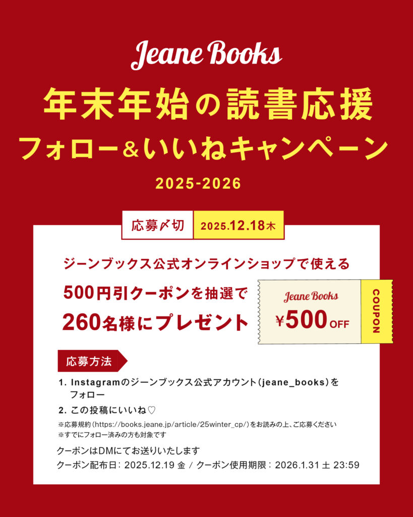 (Instagram版表記「Jeane Books 年末年始の読書応援フォロー&いいねキャンペーン」)